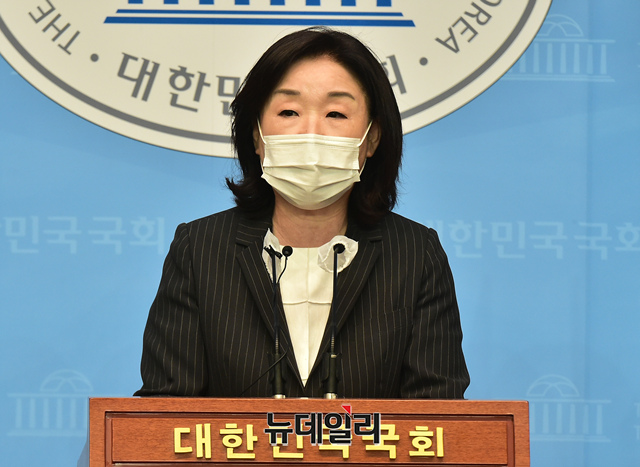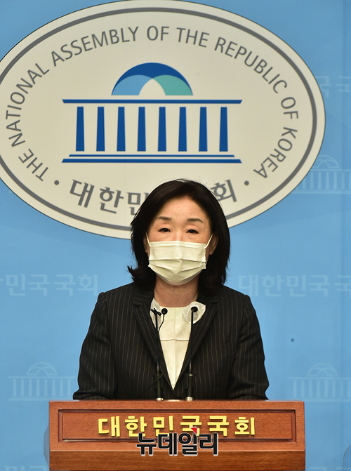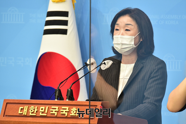 심상정 정의당 의원이 18일 오전 국회 소통관에서 더불어민주당 부동산정책 의총 관련 기자회견을 하고 있다.