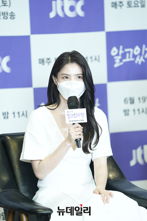 배우 한소희가 18일 오후 온라인으로 열린 JTBC는 새 토요스페셜 '알고있지만(정원 극본, 김가람 연출)' 제작발표회에서 인사말을 하고 있다.