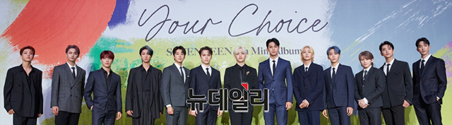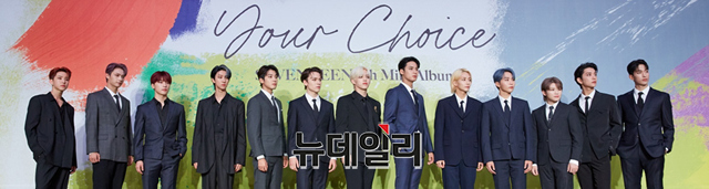 아이돌그룹 세븐틴 호시(왼쪽부터), 준, 디노, 디에잇, 원우, 버논, 에스쿱스, 민규, 정한, 승관, 우지, 조슈아, 도겸이 18일 오후 온라인으로 진행된 미니앨범 8집 'Your Choice(유어 초이스)' 발매기념 기자간담회에서 포즈를 취하고 있다.이번 앨범은 타이틀곡 'Ready to love(레디 투 러브)'를 비롯해 총 6곡이 수록됐다. 타이틀곡은 방시혁 프로듀서와 원더키드 등 하이브 레이블이 참여해 팬들의 큰 관심을 받고 있다. (사진=인터컨티넨탈)