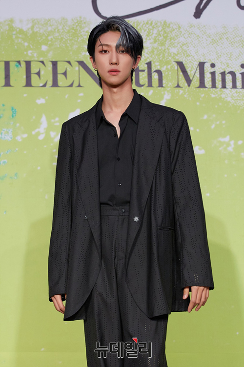 세븐틴 멤버 디에잇가 18일 오후 온라인으로 진행된 미니앨범 8집 'Your Choice(유어 초이스)' 발매기념 기자간담회에서 포즈를 취하고 있다.