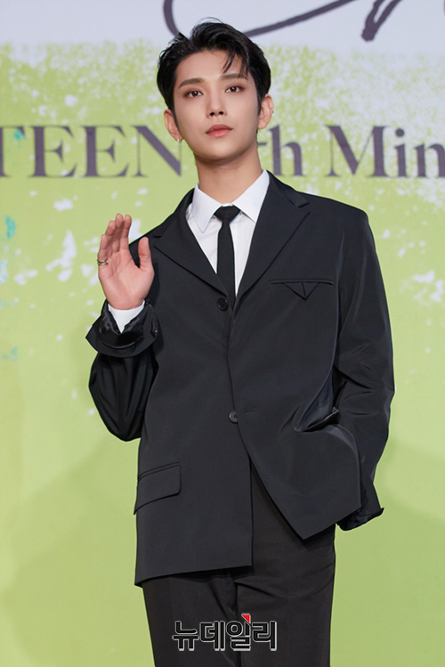 세븐틴 멤버 조슈아가 18일 오후 온라인으로 진행된 미니앨범 8집 'Your Choice(유어 초이스)' 발매기념 기자간담회에서 포즈를 취하고 있다.