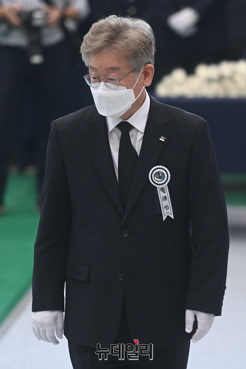이재명 경기지사가 21일 오전 경기 광주시민체육관에서 열린 '故 김동식 소방령 영결식'에서 헌화를 하고 있다.'故 김동식 소방령'은 17일 연소 확대 저지 및 인명수색을 위해 현장에 투입됐다가 실종돼 48시간 만에 발견됐지만 운명했다.20일 강한승 쿠팡 대표는 입장문을 통해 "고 김동식 소방령님의 숭고한 헌신에 모든 쿠팡 구성원의 마음을 담아 다시 한번 깊은 애도를 표한다"며 "평생 유가족을 지원할 수 있는 구체적 방안을 마련하겠다"고 밝혔다.유해는 국립대전현충원에 안장될 예정이다. (경기 광주=강민석 기자)