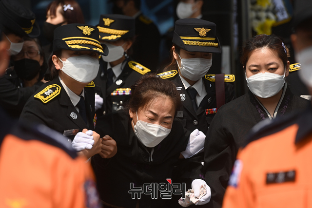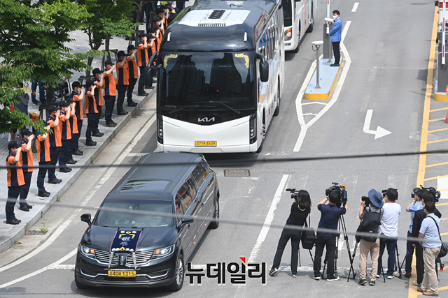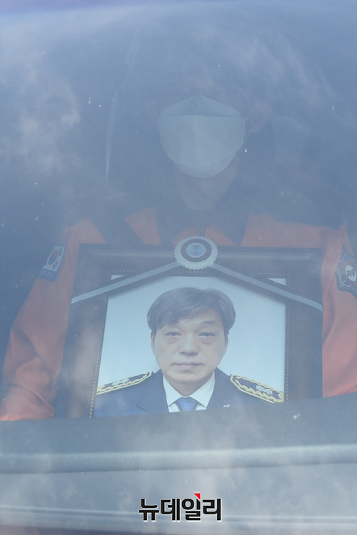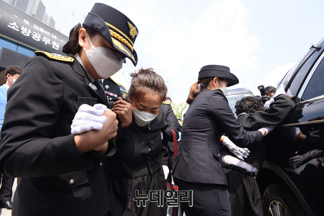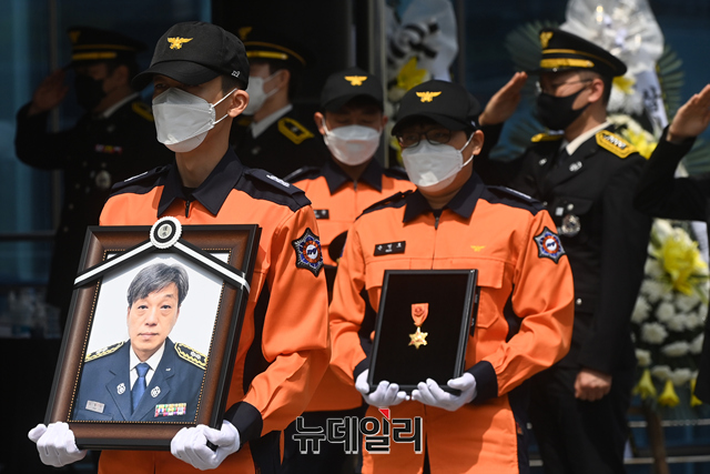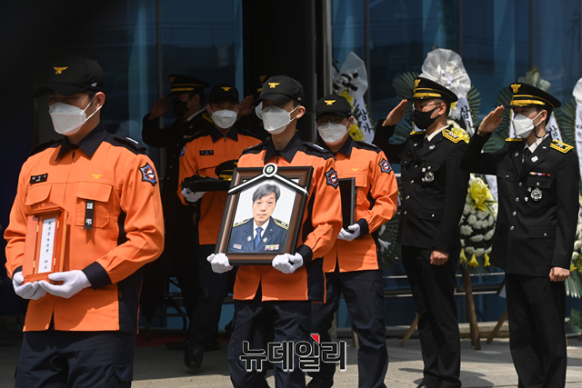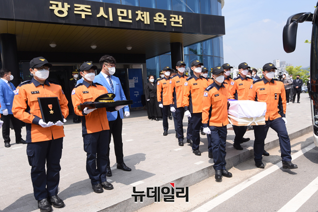 故(고) 김동식 소방령 운구행렬이 21일 오전 경기 광주시민체육관에서 거행된 영결식을 마치고 동료들의 배웅을 받으며 운구차량으로 이동하고 있다.'김 소방령'은 지난 17일 쿠팡 덕평물류센터 화재 현장 화재현장에 출동해 현장에 투입됐다가 실종돼 48시간 만인 19일 오전에 숨진 채 발견됐다.경기도는 김 소방령 에게 1계급 특진과 녹조근정훈장을 추서하고 국립대전현충원에 안장 할 예정이다.지난 20일 강한승 쿠팡대표이사는 사장 명의의 입장문을 통해 김 소방령에 애도 표하고 △故김동식 소방령 장학기금 조성 △근무 불가한 상시직 1700명 직원께 급여지급 △직원들 다른 쿠팡 사업장 전환배치 기회 제공 등 후속 대책을 발표했다.