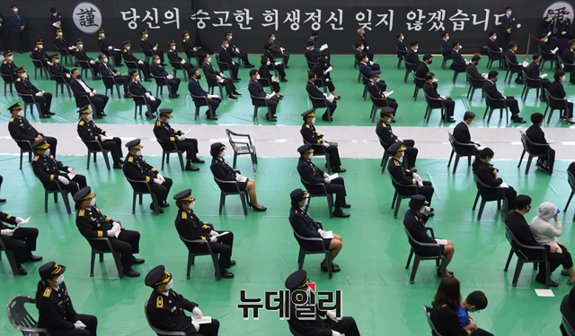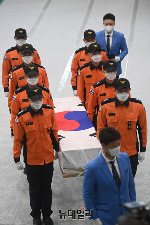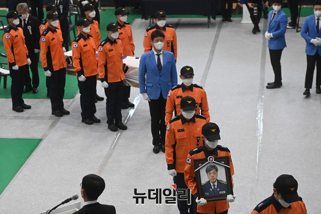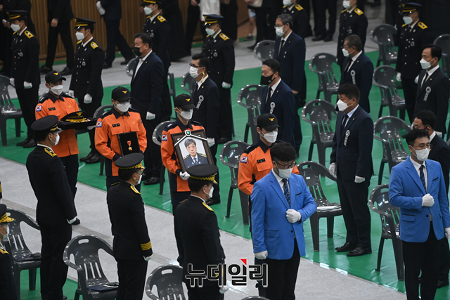 故 김동식 소방령 영결식이 21일 오전 경기 광주시민체육관에서 거행되고 있다.김 소방령은 17일 쿠팡 덕평물류센터 화재 현장 화재현장에 투입됐다가 실종돼 48시간 만인 19일 오전에 숨진 채 발견됐다.경기도는 김 소방령 에게 1계급 특진과 녹조근정훈장을 추서하고 국립대전현충원에 안장 할 예정이다.강한승 쿠팡 대표이사는 20일 사장 명의의 입장문을 통해 김 소방령에 애도 표하고 △故김동식 소방령 장학기금 조성 △근무 불가한 상시직 1700명 직원께 급여지급 △직원들 다른 쿠팡 사업장 전환배치 기회 제공 등 후속 대책을 발표했다. (경기 광주=강민석 기자)