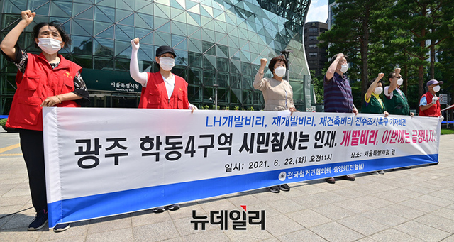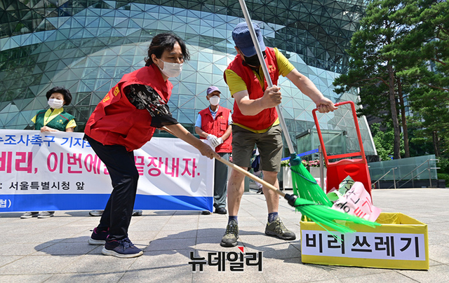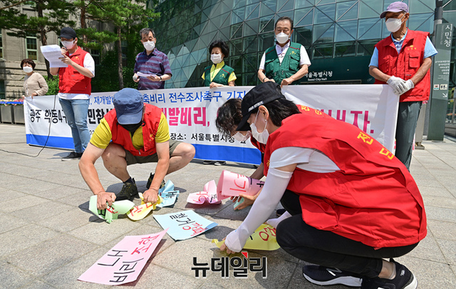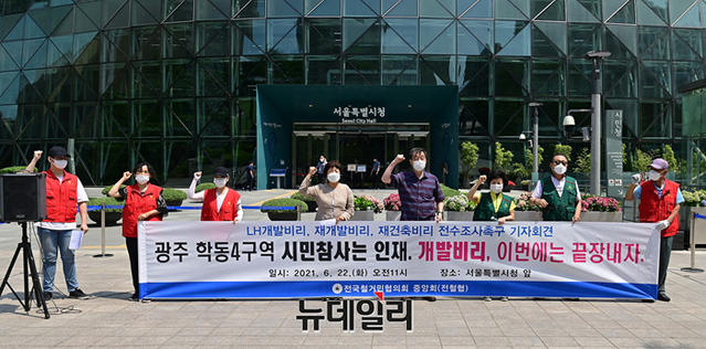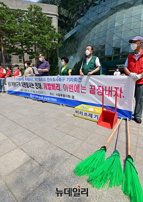 전국철거민협의회중앙회가 22일 오전 서울시청 앞에서 'LH, 재개발조합, 재건축조합 비리 전수조사'를 촉구하는 기자회견을 갖고, 각종 비리를 쓰레기통에 담는 퍼포먼스를 하고 있다.이들은 "매년 개발지역에서 부동산비리, 부패, 투기가 사회적 문제로 대두되고 있지만 부동산 개발을 주도하는 토건세력들이 투기이익을 공유하며 개발의 정당성을 강화했다"며 "최근 광주 학동4구역 개발과정에서 일어난 참사는 예견된 인재"라며 부동산 개발비리를 전수조사를 요구했다.