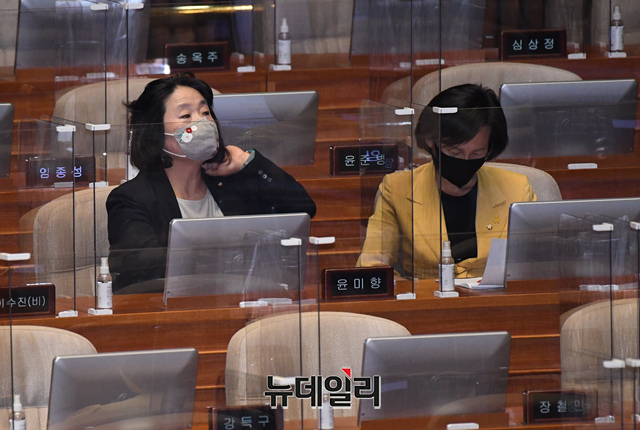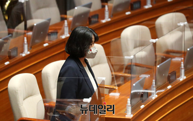 부동산 투기 의혹으로 더불어민주당에서 제명된 윤미향 의원이 22일 오후 국회에서 열린 본회의에 참석해 앉아 있다. (사진=공동취재단)
