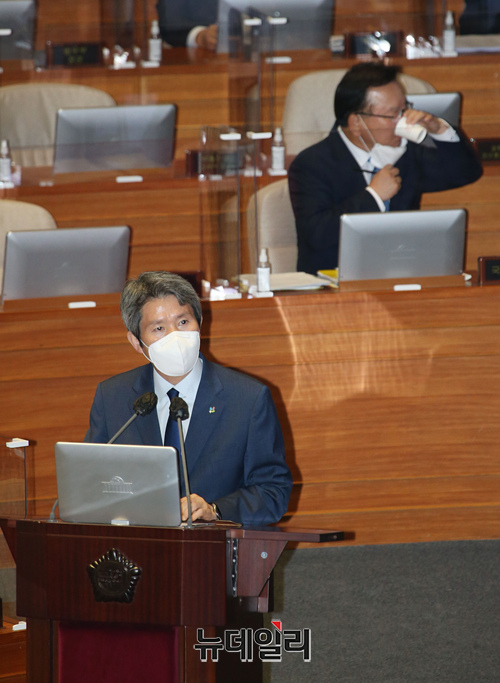 이인영 통일부장관이 22일 오후 국회에서 열린 본회의에서 정치·외교·통일·안보에 관한 대정부질문에 답변하고 있다. (사진=공동취재단)