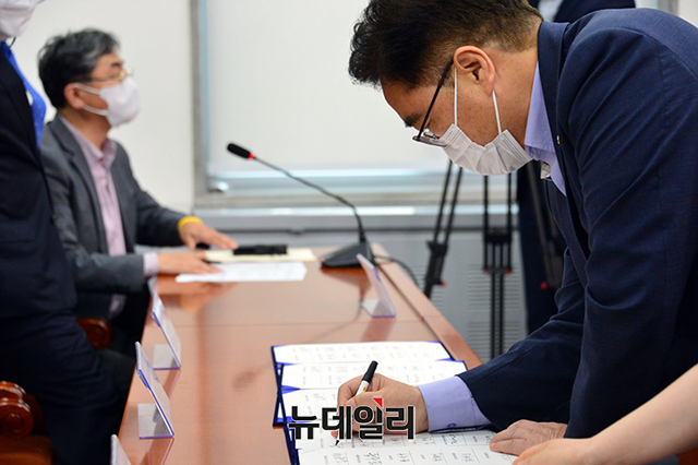 송영길 더불어민주당 대표가 22일 오전 국회에서 열린 택배종사자 과로대책 사회적합의기구 2차 합의문 발표에 참석하여 기념촬영을 하고 있다. (사진=더불어민주당)
