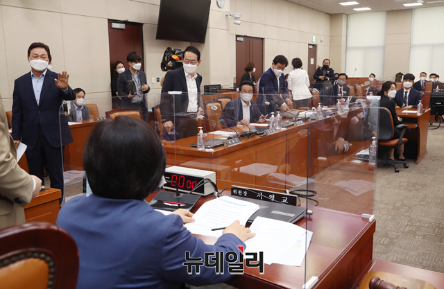 서영교 국회 행정안전위원회 위원장이 23일 오전 국회 행정안전위원회 전체회의에서 대체공휴일을 확대 적용하는 대체공휴일법을 처리하려하자 국민의힘 박완수 간사를 비롯한 의원들이 이에 반대하며 퇴장하고 있다. (사진=공동취재단)
