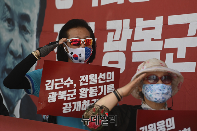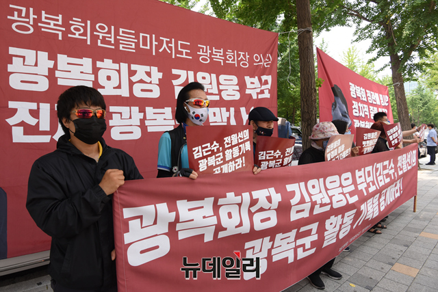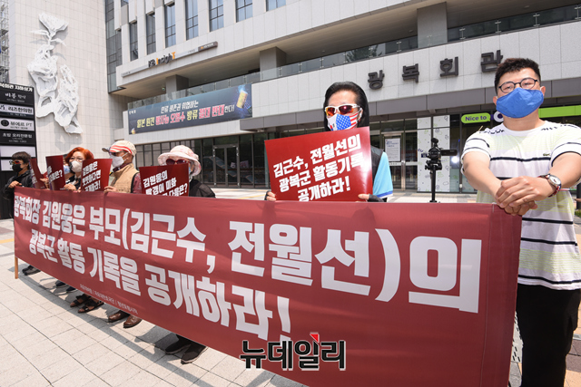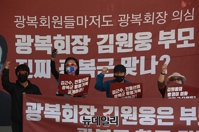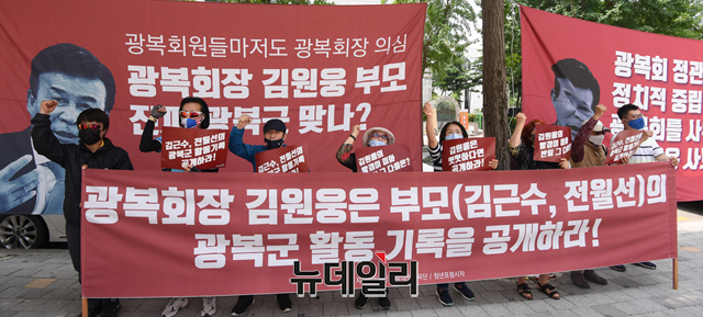 자유대한호국단, 자유의바람, 청년포럼시작 등이 23일 오후 서울 여의도 광복회관 앞에서 기자회견을 열고, 김원웅 광복회장의 부모(김근수, 전월선)에 대한 광복군 활동 기록 공개를 촉구 했다.