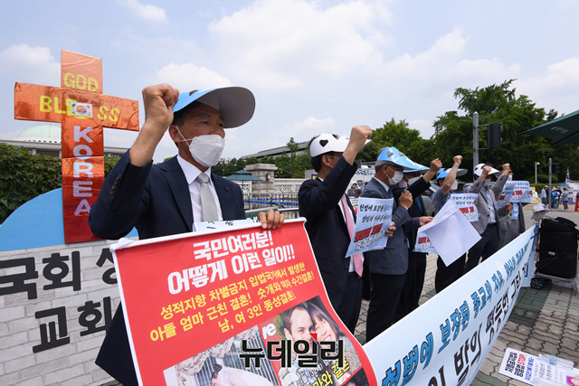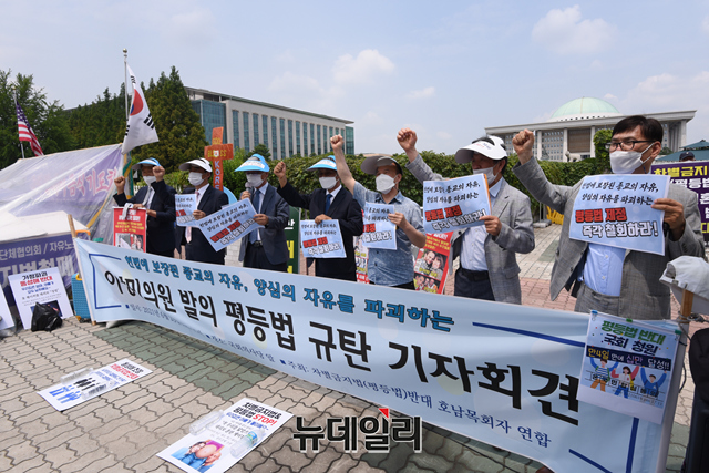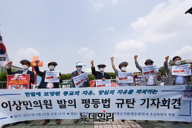 차별금지법(평등법)반대 호남목회자연합이 23일 오전 서울 여의도 국회 앞에서 이상민 더불어민주당 의원 등이 발의한 평등법 철회를 촉구하는 기자회견을 갖고 있다.이들은 "이상민 의원이 대표 발의한 평등법은 목회자들과 신앙인들에게 종교적 표현의 자유, 종교교육의 자유, 선교의 자유를 박탈한다"며 "국가가 종교를 탄압하는 수단으로 평등법이 사용될수 있다"고 주장했다.장혜영 정의당 의원이 대표 발의한 '차별금지법안'과 이상민 더불어민주당 의원이 대표 발의한 '평등에 관한 법률안(평등법)'은 국회 법사위 심의를 앞두고 있다.