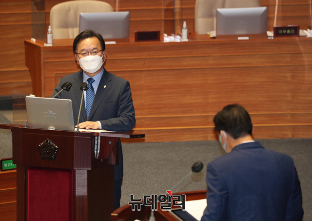 김부겸 국무총리가 23일 오후 국회 본회의장에서 열린 경제분야 대정부질문에서 의원 질의에 답하고 있다. (사진=공동취재단)
