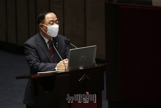 홍남기 경제부총리 겸 기획재정부 장관이 23일 오후 국회 본회의장에서 열린 경제분야 대정부질문에서 의원 질의에 답하고 있다. (사진=공동취재단)