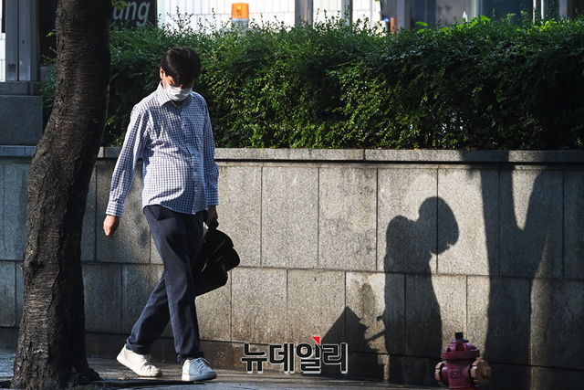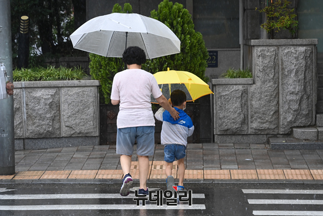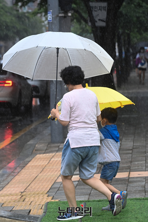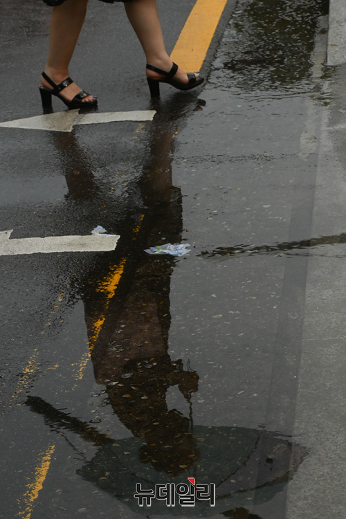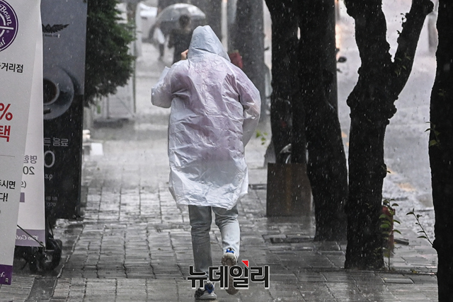 전국이 흐리고 곳곳에 소나기가 내린 23일 오후 서울 강남구의 한 거리에 우의 입은 시민이 발걸음을 재촉하고 있다.