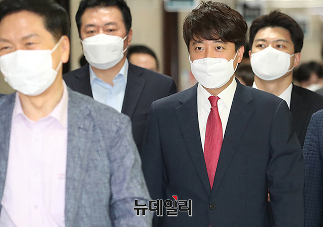 이준석 국민의힘 대표가, 김기현 원내대표 및 지도부가 24일 오전 국회에서 열린 최고위원회의에 참석하기 위해 입장하고 있다. (사진=국민의힘)