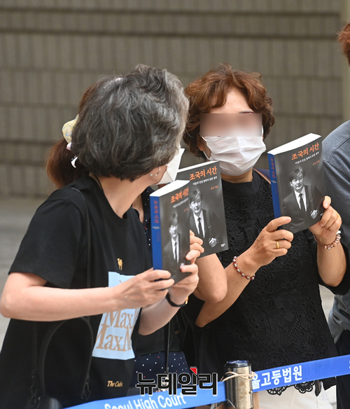 조국 전 법무부 장관의 지지자들이 25일 오전 서울 서초구 서울중앙지법에서 자녀 입시비리 혐의 등으로 기소된 조국 전 법무부 장관 재판에 앞서 최근 출간한 '조국의 시간' 서적을 들고 조 장관을 기다리고 있다.