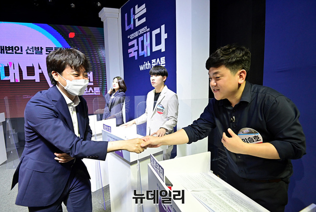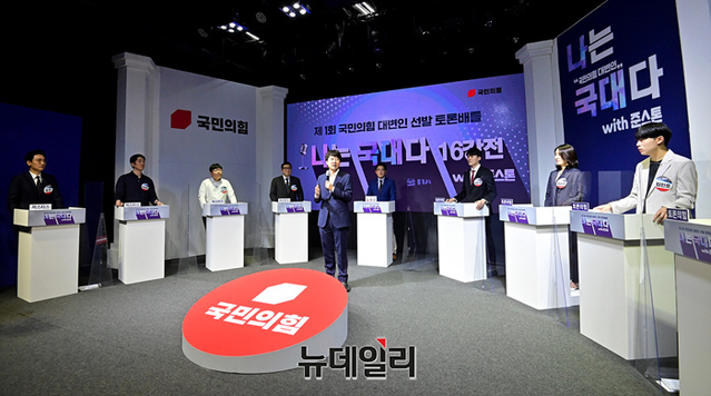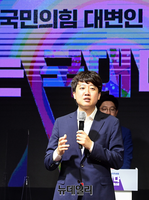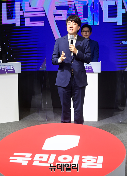 이준석 국민의힘 당표가 27일 오후 서울 영등포구 더플러스 스튜디오에서 진행된 국민의힘 대변인 선발토론회 '나는국대다' 16강 전을 앞두고 인사말을 하고 있다.16강은 4명씩 팀을 나눠 2부로 진행된다. 토론회 주제는 '만65세 이상 지하철 무임승차 찬반' '제5차 재난지원금 전국민 지급 찬반' 등 2개다.심사위원은 이준석 당대표, 배현진 최고위원, 김용태 청년최고위원, 황보승희 수석대변인이 맡았다. 토론회는 국민의힘 유튜브 채널 오른소리와 뉴데일리TV 등으로 생중계 된다. 결과는 토론회가 종료되는 즉시 발표된다.