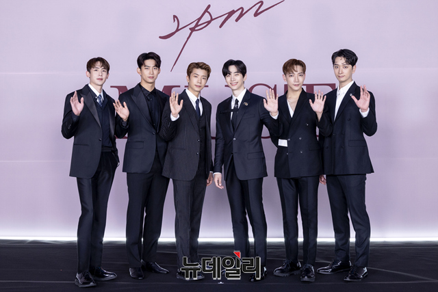 아이돌그룹 2PM 닉쿤(왼쪽부터), 택연, 우영, 준호, 준케이, 찬성이 28일 오후 온라인으로 진행된 정규 7집 'MUST(머스트)' 발매 기념 기자간담회에서 포즈를 취하고 있다.