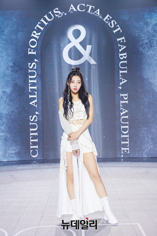 걸그룹 이달의소녀(LOONA) 멤버 이브가 28일 오후 온라인으로 진행된 네번째 미니앨범 '&(앤드)' 발매기념 기자간담회에서 포토타임을 갖고 있다.