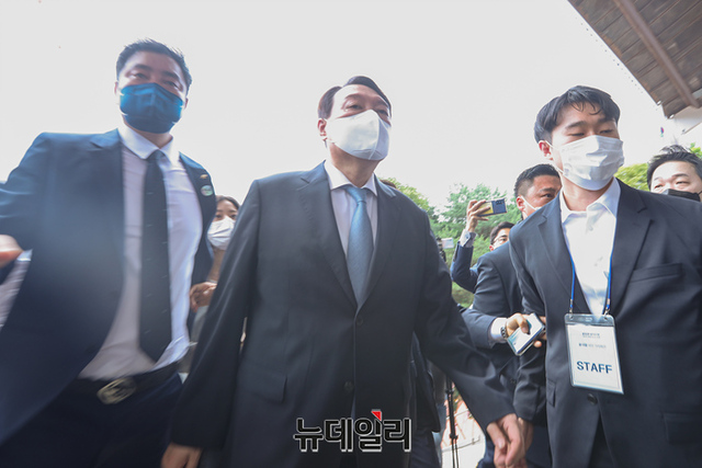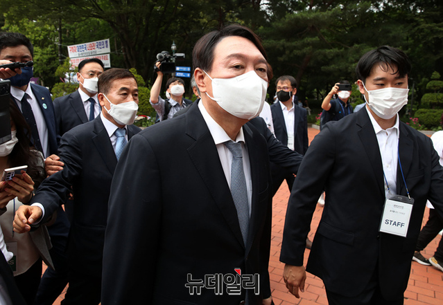 대선출마 선언을 앞둔 윤석열 전 검찰총장이 29일 오전 서울 서초구 윤봉길 의사 기념관으로 입장하고 있다. (사진=공동취재단)
