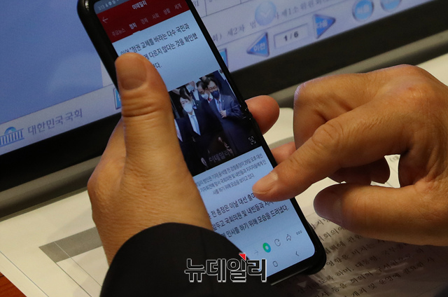 윤석열 전 검찰총장의 대선 출마 선언을 한 29일 오후 국회에서 열린 본회의에서 야당의 한 의원이 휴대폰으로 관련한 뉴스를 보고 있다. (사진=공동취재단)