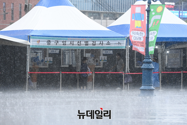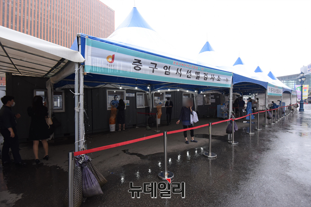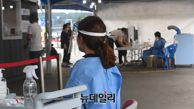 코로나19 신규 확진자가 595명 발생한 29일 오후 서울 중구 서울역 광장에 마련된 임시 선별검사소에서 의료진이 검체를 채취 하고 있다.