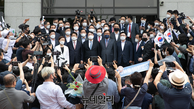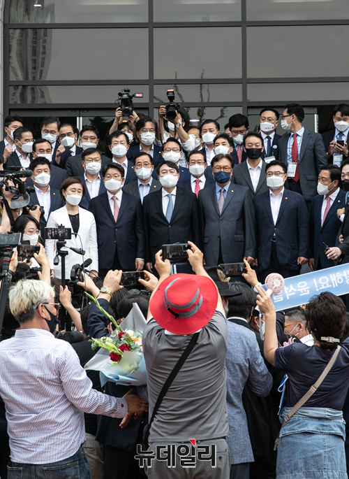 윤석열 전 검찰총장이 29일 오후 서울 서초구 매헌윤봉길의사기념관에서 대선 출마 기자회견에 앞서 국민의힘 의원들과 기념촬영을 하고 있다.