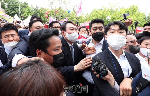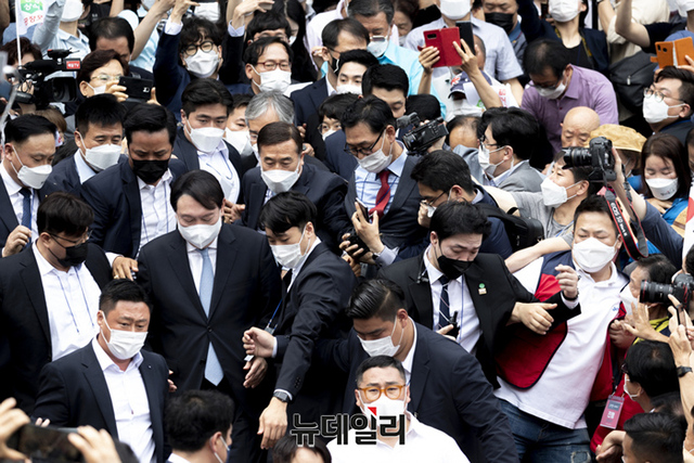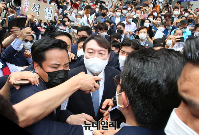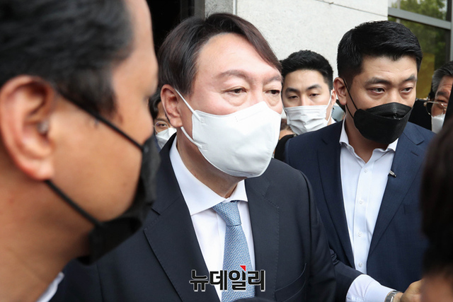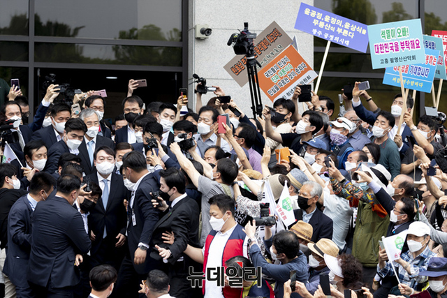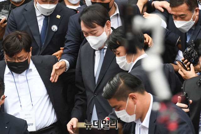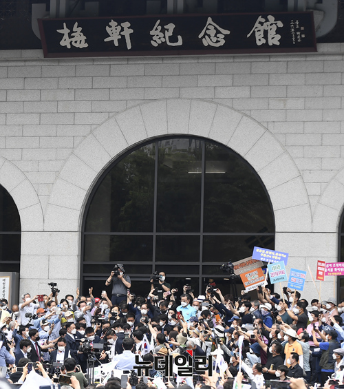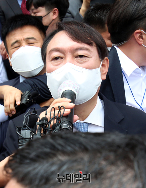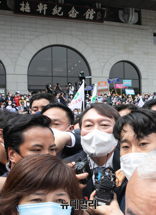 윤석열 전 검찰총장이 탄 차량이 29일 오후 서울 서초구 매헌윤봉길의사기념관에서 대선 출마 기자회견을 마치고 빠져나가고 있다. 지지자들은 "윤석열 대통령"을 연호하며 윤 전 총장을 응원했다.