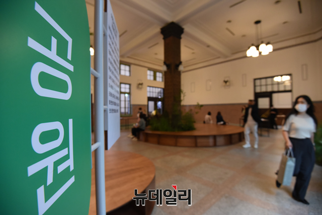 '익숙한 미래: 공공디자인이 추구하는 가치' 기획전시를 찾은 시민들이 30일 오전 서울 중구 문화역 서울284에 개막한 전시장을 관람하고 있다.