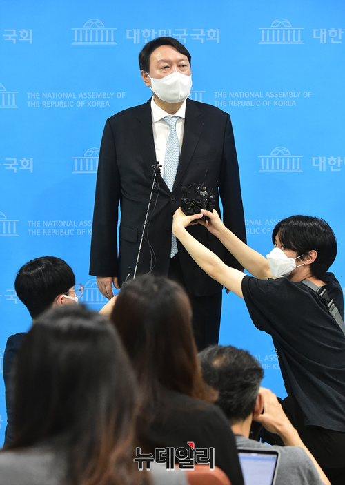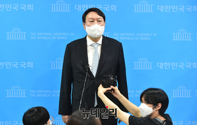 대선 출마를 선언한 윤석열 전 검찰총장이 30일 오전 국회 소통관을 찾아 기자들과 인사를 마친 후 질문에 답하고 있다.