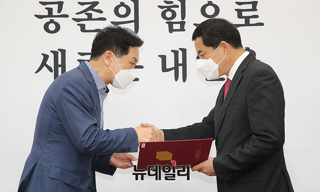 김기현 국민의힘 원내대표가 30일 오후 국회에서 열린 文정부 탈원전 정책에 따른 경제 피해 및 환경 파괴 대책 특별위원회에 참석해 박대출 특위 위원장에게 임명장을 전달하고 있다. (사진=국민의힘)