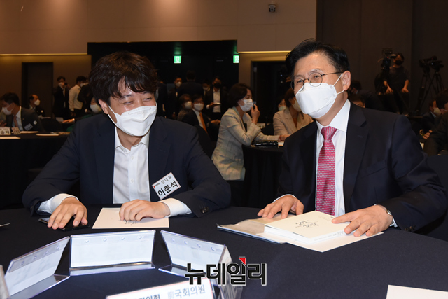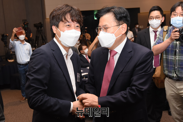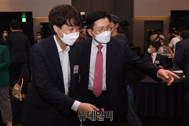 황교안 전 미래통합당 대표와 이준석 국민의힘 당대표가 30일 오후 서울 서대문구 연세대학교 백양누리 그랜드볼룸에서 열린 황 전 대표의 출판기념회에서 만나 대화를 나누고 있다.