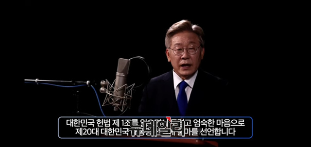 더불어민주당 대선 주자인 이재명 경기도지사가 1일 오전 온라인을 통해 제20대 대통령 선거 출마를 선언하고 있다.이 지사는 '새로운 대한민국! 이재명은 합니다!' 영상 선언문을 통해 "새로운 대한민국, 더 나은 국민의 삶으로 보답하겠다"며 출마의사를 밝혔다. (사진=이재명 경기지사 출마영상 캡쳐)