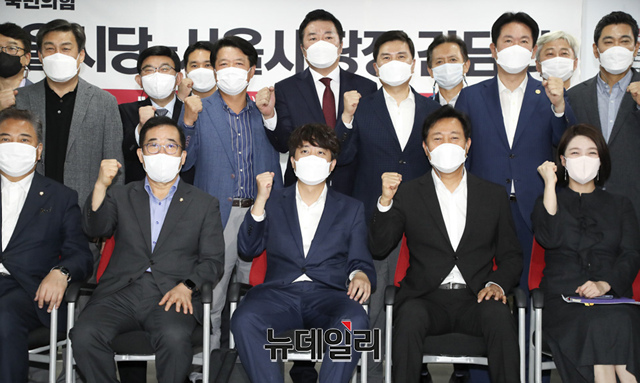 이준석 국민의힘 대표, 오세훈 서울시장, 박성중 서울시당 위원장 등 참석자들이 2일 오전 서울 여의도 중앙당사에서 열린 서울시당·서울특별시 당정 간담회에서 기념사진을 촬영하고 있다. (사진=국민의힘)