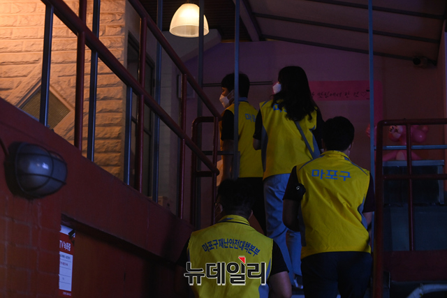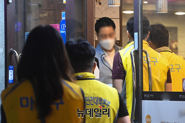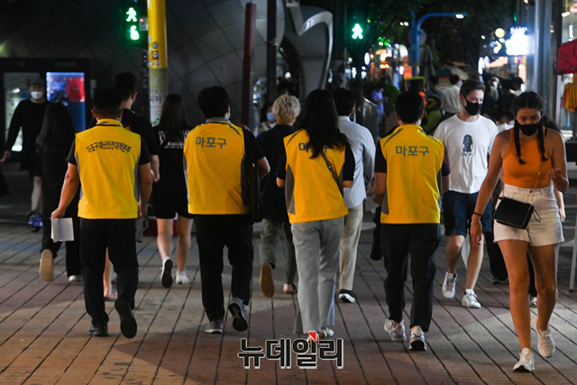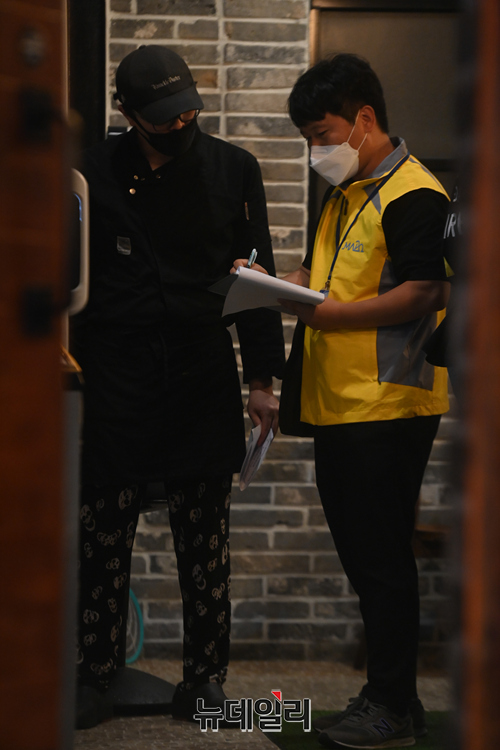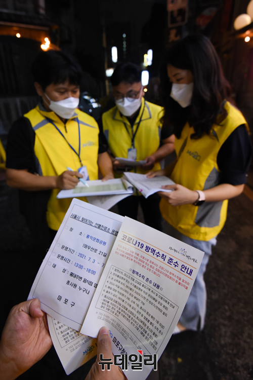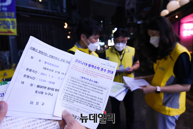 마포구 특별방역대책 점검반이 4일 오후 서울 마포구 홍대 한 음식점에서 코로나19 방역수칙 안내문 배부와 특별방역활동 캠페인 등을 하고 있다.마포구는 "일일 60명 점검반을 편성해 14일까지 홍대일대 식당, 카페, 주점 등 1,200여 개 업소를 대상으로 오후 9시30분부터 23시까지 특별 방역점검을 실시한다"고 밝혔다.이번 특별 방역 활동에는 지역의 자원봉사인력 '마포시민순찰대'와 경찰이 함께 활동한다.주요 점검사항은 △5인 이상 사적모임금지 △마스크 착용 여부 △동 시간대 이용가능인원 준수 여부 △출입자 명부 작성관리 등 시설별 방역수칙 이행 여부 등이다.