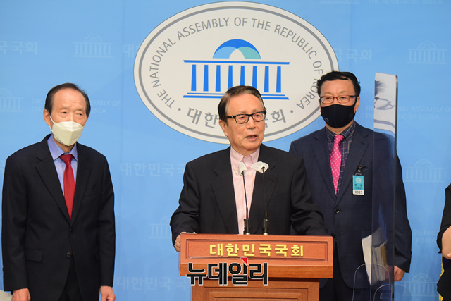 박찬종 전 의원이 5일 오전 국회 소통관에서 열린 장기표 국민의힘 김해을 당협위원장 대선 출마 기자회견에 참석해 지지발언을 하고 있다.