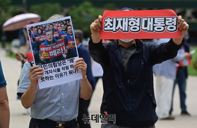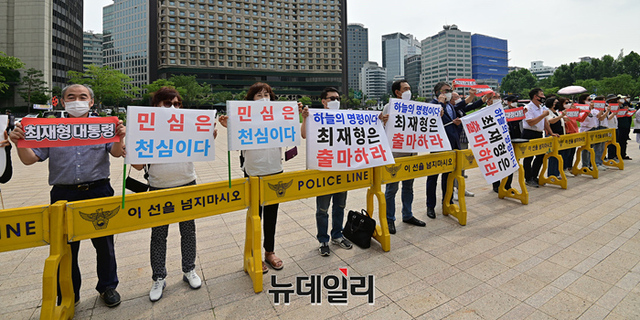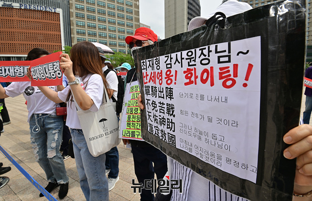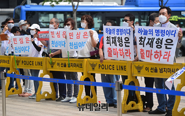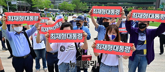 최재형 전 감사원장을 지지하는 국민모임 '별을품은사람들'이 5일 오후 서울광장에서 최 전 원장의 대선출마를 촉구하는 기자회견에서 최 전 원장의 대선 출마를 촉구하는 손피켓을 들고 있다.지지자들은 '민심은 천심이다' '최재형 대통령' '하늘의 명령이다 최재형은 출마하라' 등의 손피켓을 들고 기자회견장에 참석했다.지지모임은 '월세' '결혼자금' '학자금대출' '노후자금' '아파트' '사교육비 대학등록금' 등의 문구가 적힌 짐을 지게에 지고 기자회견장을 도는 퍼포먼스를 진행했다.