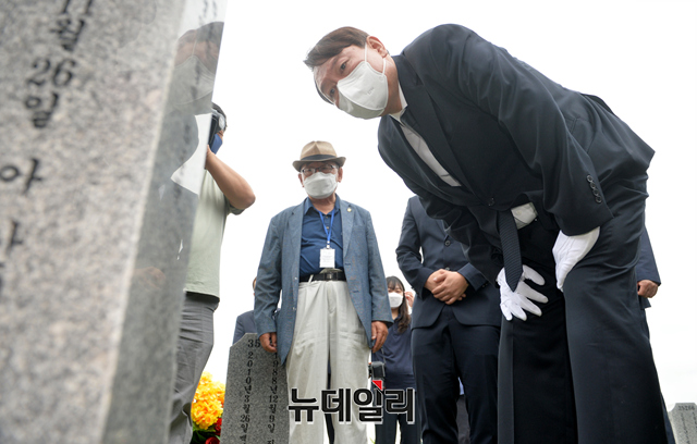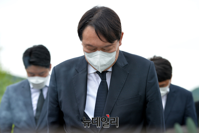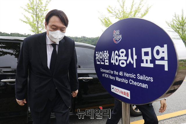 윤석열 전 검찰총장이 6일 오전 대전 유성구 국립대전현충원 천안함 46용사묘역을 찾아 헌화하고 묵념을 하고 있다.