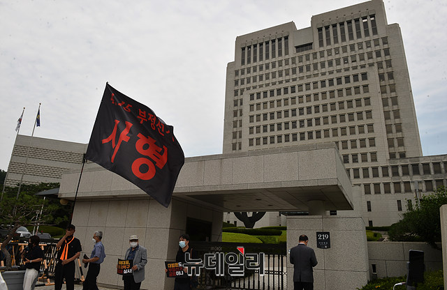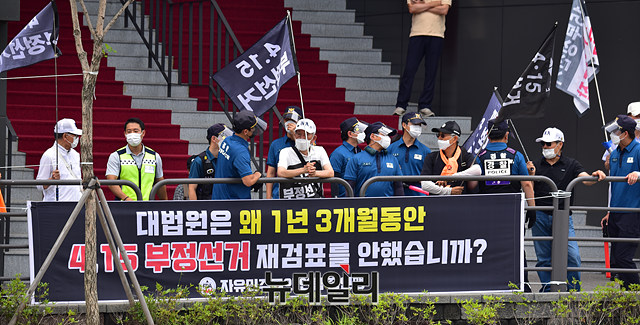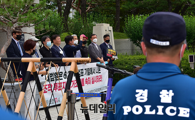 4.15부정선거국민투쟁본부 회원들이 6일 오후 서울 서초구 대법원 정문 앞에서 6.28재검표 기일과 관련해 긴급 기자회견을 열고, 조작선거 의혹 물증에 대한 증거조사를 촉구하고 있다.
