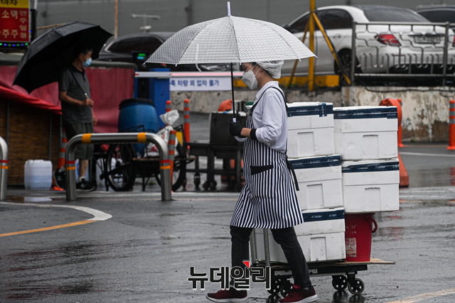 곳곳에 장맛비가 내린 6일 오후 대전 동구 대전역 일대에서 미처 우산을 챙기지 못한 시민이 발걸음을 재촉하고 있다.