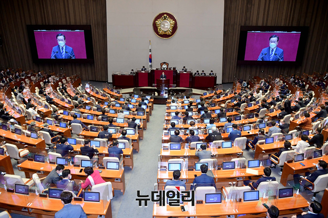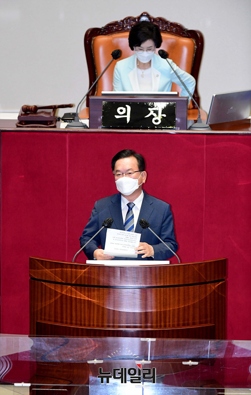 김부겸 국무총리가 8일 오전 국회에서 열린 본회의에서 2차 추경안 관련 시정연설을 하고 있다. (사진=공동취재단)