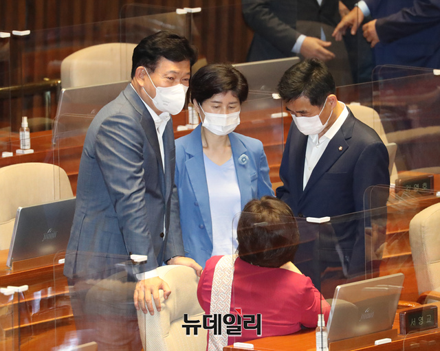 송영길 더불어민주당 대표가 8일 오전 국회 본회의에서 김부겸 국무총리 2차 추가경정예산안 관련 시정연설을 앞두고 동료의원들과 대화를 나누고 있다. (사진=공동취재단)