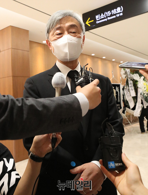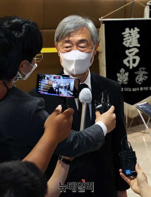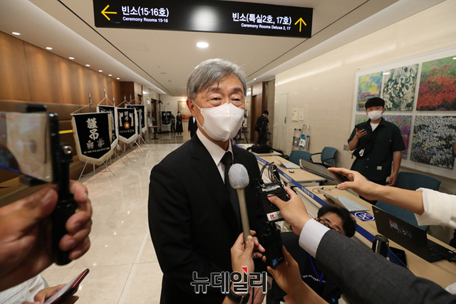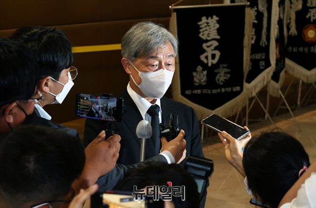 최재형 전 감사원장이 8일 오전 서울 서대문구 연세대학교 세브란스병원 장례식장에 마련된 부친 최영섭 예비역 해군 대령 빈소에서 취재진을 만나고 있다. (사진=공동취재단)
