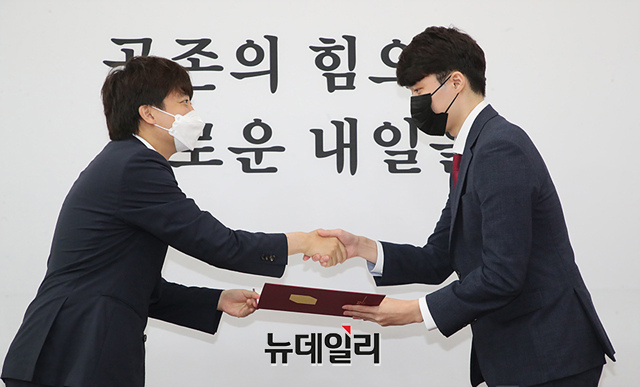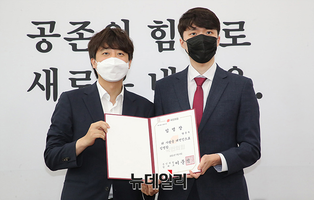 이준석 국민의힘 대표가 8일 오전 국회에서 열린 신임 대변인단 임명장 수여식에서 양준우 대변인에게 임명장을 수여하고 있다. (사진=국민의힘)