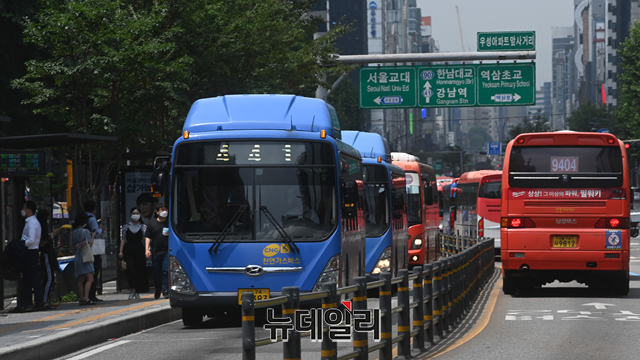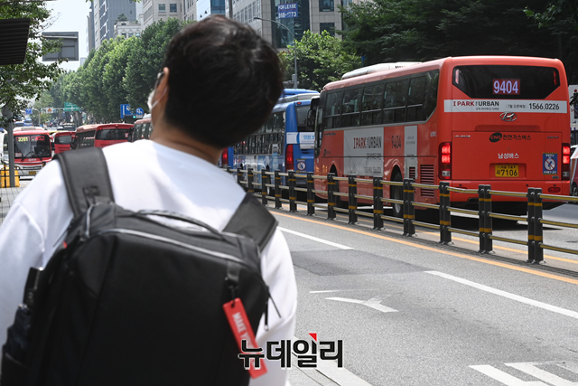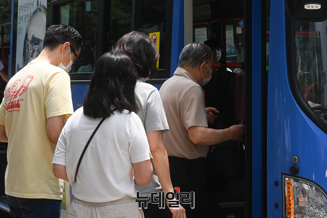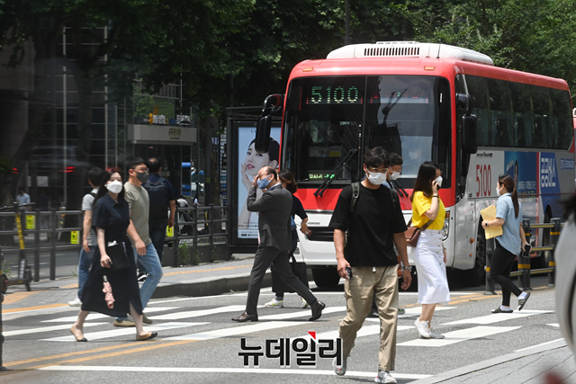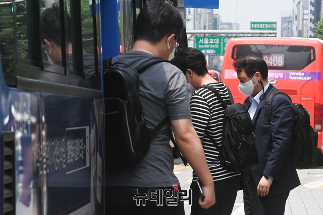 서울과 수도권에서 코로나19 신규 확진자가 급증한 8일 오후 서울 강남구 강남대로 버스정류장에서 시민들이 버스를 탑승하기 위해 줄을 서고 있다.