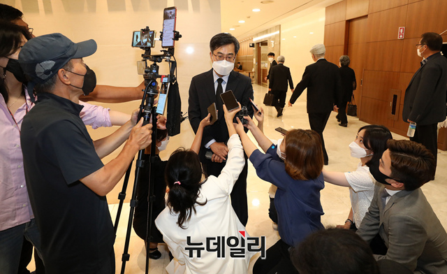 김동연 전 경제부총리가 8일 오후 서울 서대문구 연세대학교 세브란스병원 장례식장에 마련된 최재형 전 감사원장의 부친 최영섭 예비역 해군 대령 빈소 조문을 마치고 나서며 취재진 질문에 답하고 있다.