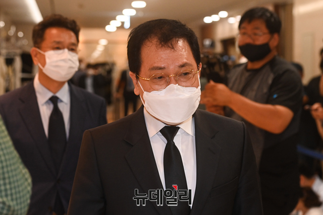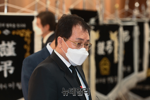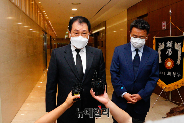 유영민 청와대 비서실장과 이철희 정무수석이 8일 오후 서울 서대문구 신촌세브란스병원 장례식장에 마련된 최재형 전 감사원장의 부친 최영섭 예비역 대령의 빈소에서 조문을 마친후 취재진의 질문에 답하고 있다.
