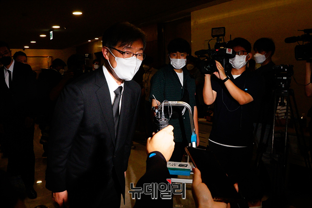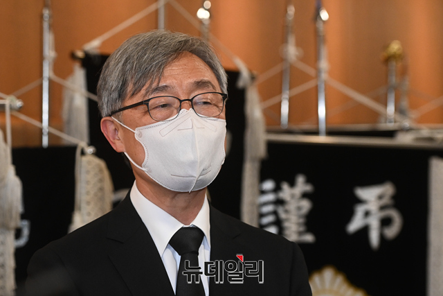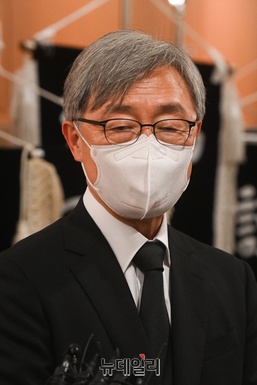 최재형 전 감사원장이 8일 오전 서울 서대문구 신촌세브란스병원 장례식장에 마련된 부친 최영섭 예비역 대령의 빈소에서 잠시 나와 취재진의 질문에 답하고 있다.