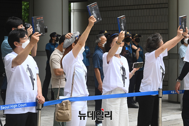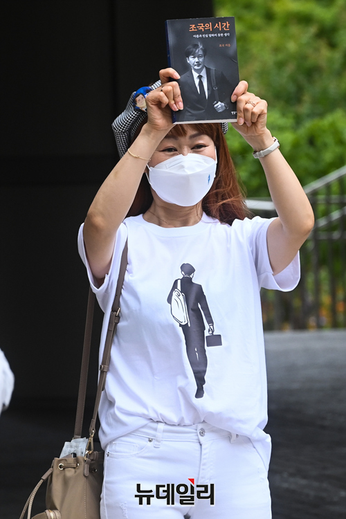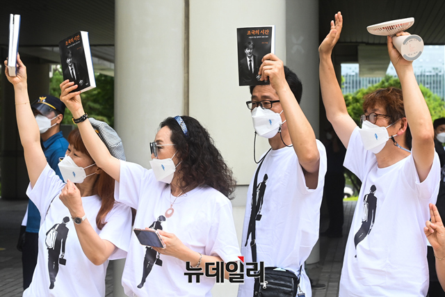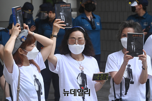 조국 전 법무부 장관 지지자들이 9일 오후 서울 서초구 서울중앙지법에서 열린 재판에 앞서 출간한 서적을 들고 구호를 외치고 있다.