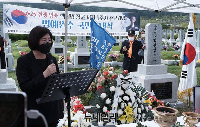 정경희 국민의힘 의원이 10일 오후 대전 유성구 국립대전현충원 백선엽 장군 묘역에서 열린 고 백선엽 장군의 명예원수 추대식 행사에 참석해 자리하고 있다. (대전=정상윤 기자)